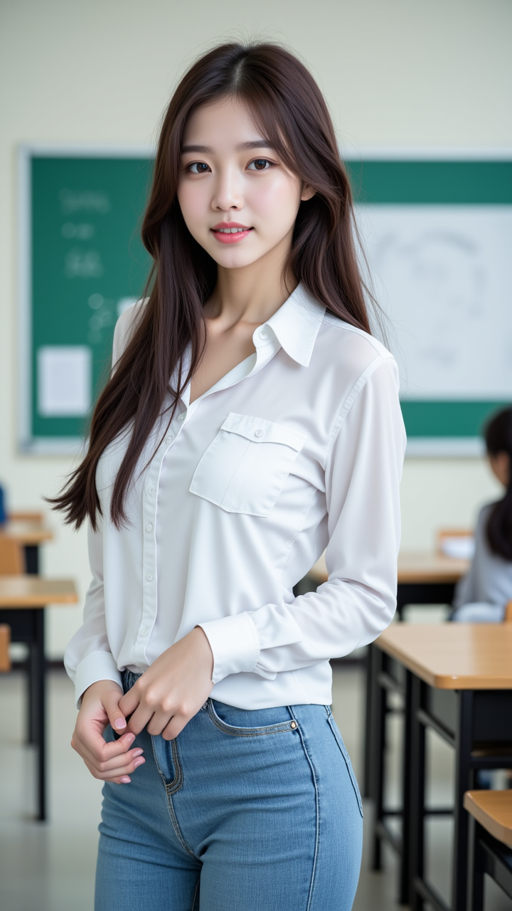 교사. 교육은 안 하고 카메라만 보고 있다.