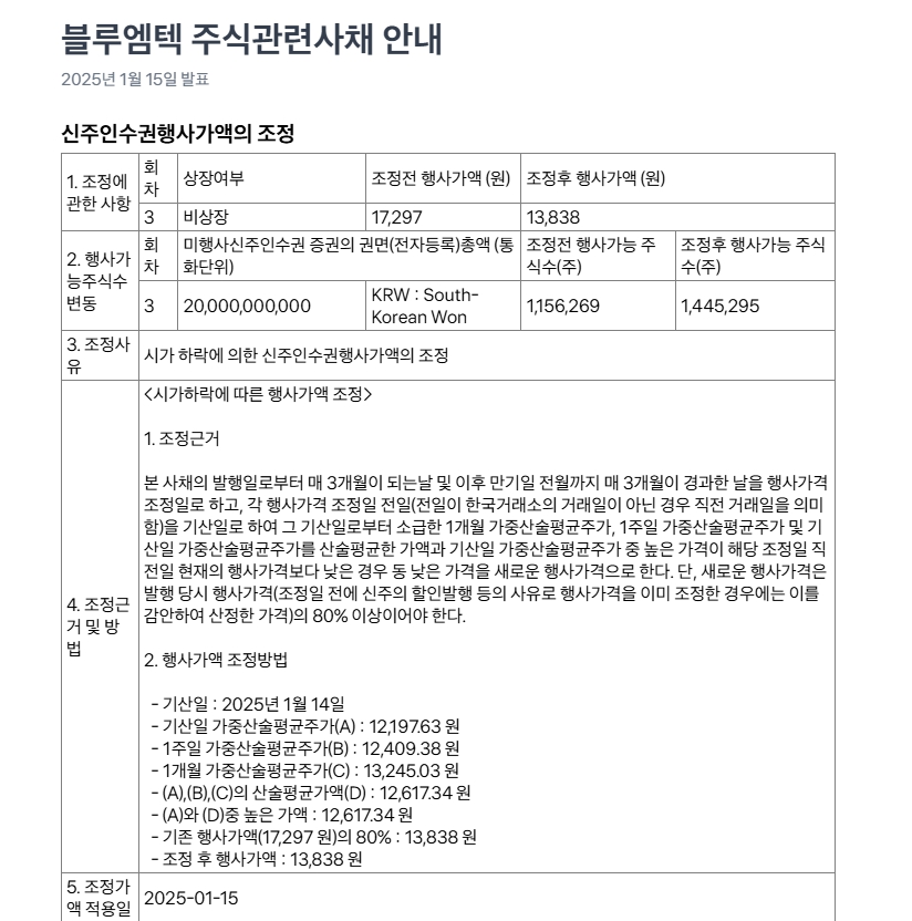 - 현재 시장 상황에서 신주인수권 행사 가격(13,838원)은 매력적이지 않습니다. 블루엠텍은 행사 가격을 더 낮추거나 주가를 올릴 수 있는 명확한 전략(예: 실적 개선 기대치 발표)을 제시할 필요가 있습니다.