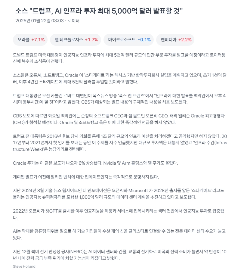 - 투자 계획: 트럼프 전 미국 대통령이 최대 5천억 달러 규모의 민간 AI 인프라 투자 계획을 발표할 예정.