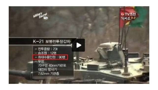 - 90명이 장갑차 내부에 꽉 차 있으면, 병력의 무기 사용 및 작전 수행 불가.