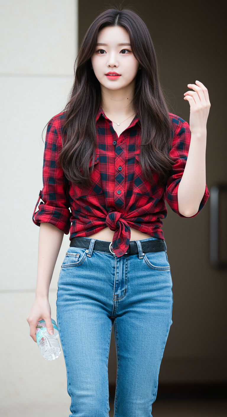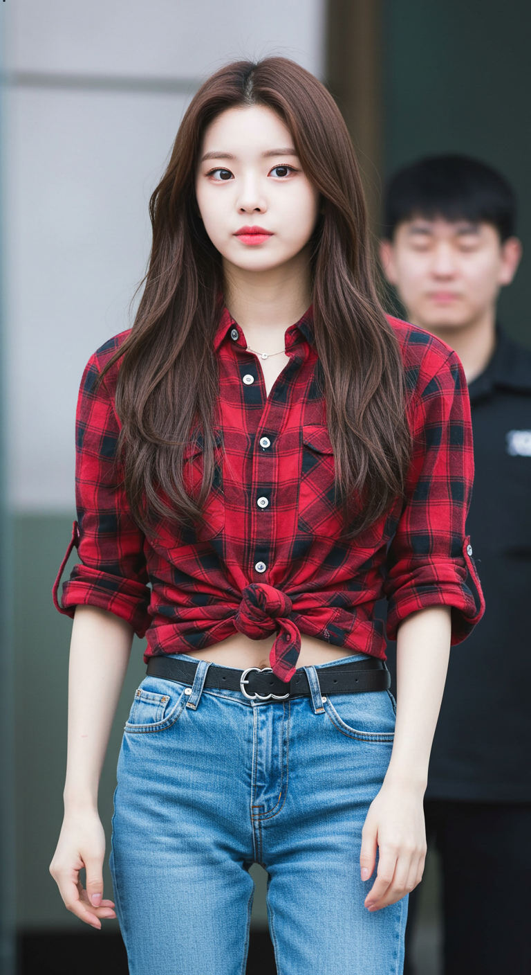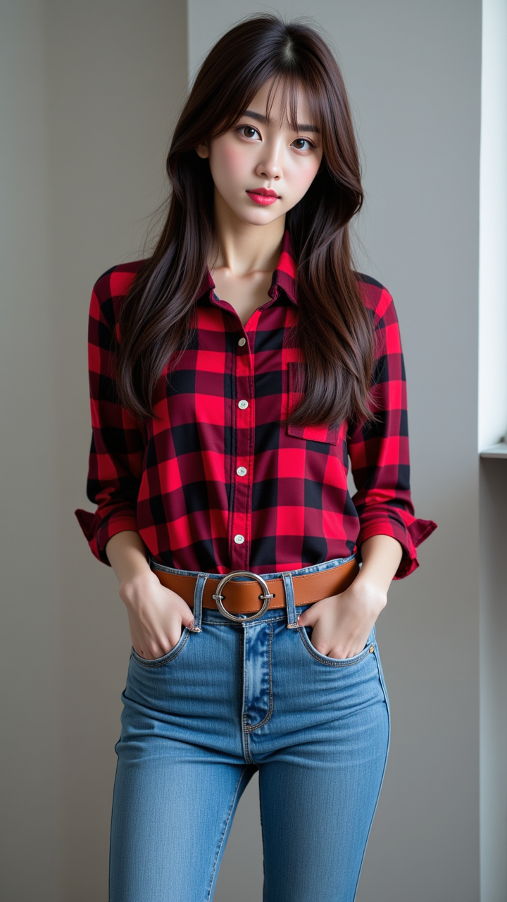 2. 빨간 체크무늬 상의에 청바지 패션