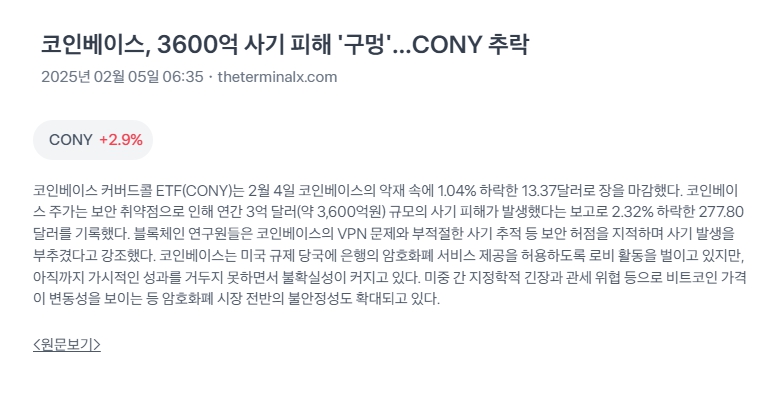 👉 결론: 코인베이스의 보안 문제와 규제 불확실성, 미중 긴장 속에서 코인베이스 관련 ETF(CONY)와 주가가 동반 하락함. 🚨