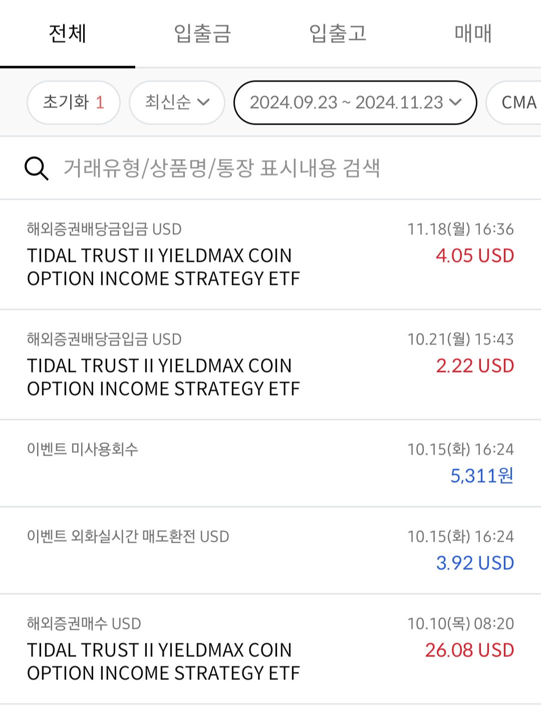 2024년 11월 Cony 배당금 주당 16~18불을 왔다갔다 하는데 주당 2.0231불이라는 매우 풍족한 배당금이 결정되어11월 19일 지급되었습니다.투자원금이 1047불인데 배당금 두달 실수령액만 벌써 221불임 주식/매도 매수 및 배당 2024.11.23