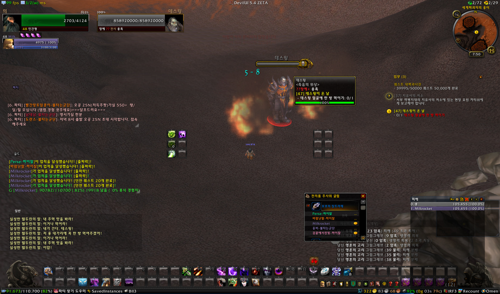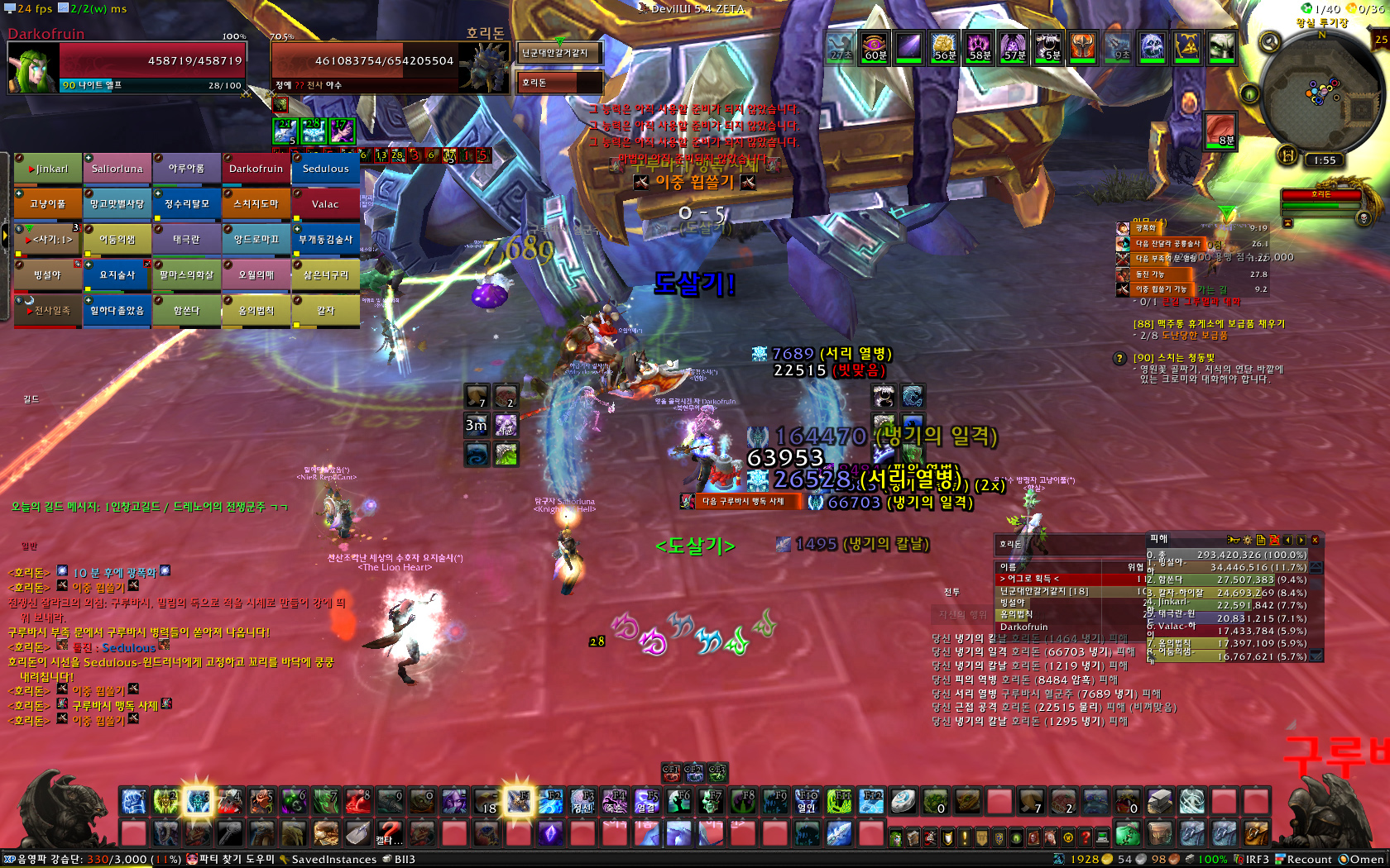 1넴 잿빛너울. 분열 재결합 무한반복하다보면 어느새 잡혀있다. 몹시 지루함 2넴 쓰러진 수호자들. 너무 빨리 잡거나 쑨을 맨 마지막에 죽이면 리셋되는 버그가 있어서 주의해야 한다. 3넴 타락의 결정체. 그냥 때려잡으면 됨. 격냥 조사땡기면 2-3초컷이다. 4넴 교만의 샤. 얘도 닥딜만 하면 되서 별거업다. 5넴 갈라크리스. 남탑 뚜껑 딸때까지 폭파조 지키면서 본진으로 가는 쫄처리하다가, 탑 열리면 대포 타고 갈라크리스 2방만 맞추면 된다. 6넴 강철의 거대괴수. 이거 닮은 탈것 먹겠다고 온거긴 하다. 닥딜보스. 아무 공략 필요없음 7넴 코르크론 암흑주술사. 포풍! 대지! 그리고 불! 이지랄하는데 닥딜하면 아이트리그 대사 끝나기전에 잡기 가능 8넴 장군 나즈그림. 호드에서 몇 안 되는 충직한 넴드...ㅠㅠ..