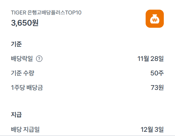 TIGER 은행고배당플러스TOP10 배당금 입금 1주당 73원의 배당금이 오늘 지급되었다.현재 TIGER 은행고배당플러스TOP10의 1주당 가격은 15,460원이며, 이번에도 과표기준에 따라 제세금은 0원이다.해당 ETF를 구성하고 있는 종목은 위 사진과 같다. 주식/매도 매수 및 배당 2024.12.03