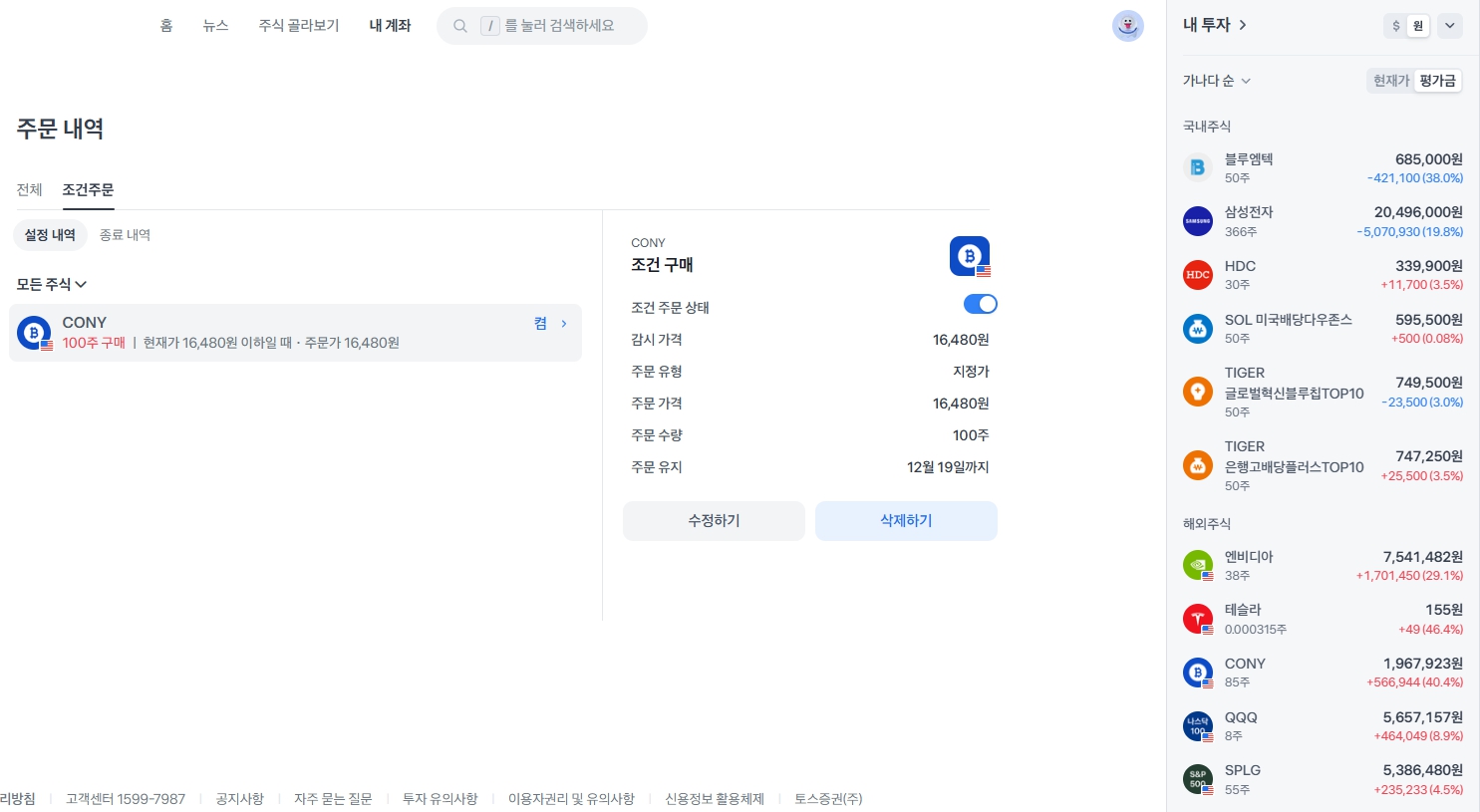 2024년 11월 23일 포트폴리오 CONY 현재 평균단가(16,482원) 밑으로 추매 100주 걸어놨다. 12월 19일까지 안사지면 말고 ㅎㅎ 주식/보유 주식 포트폴리오 2024.11.23