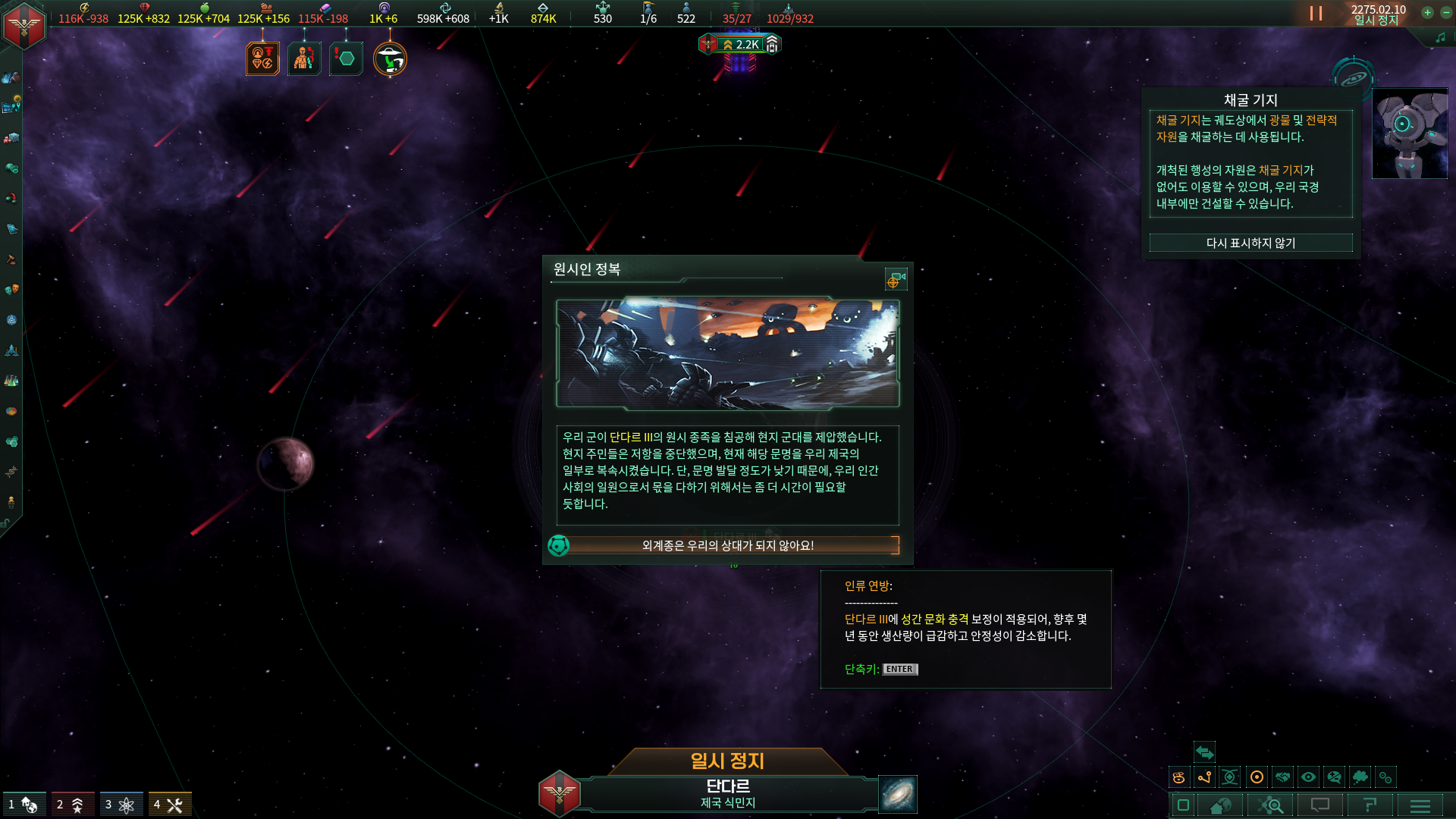 첫 게임은 인류연방으로은하계 중앙에 조그맣게 자리잡고 있다. 뉴비라서 콘솔플레이 하는중첫 적행성 점렴함대전인류연방의 수도성인 유니티수도성계인 데네브. 이걸 따서 인류연방은 '데선족'이라 그런다. 정작 인류의 고향인 지구 거주 적합도가 80%밖에 안뜨기때문고향인 지구를 점령했다.영토를 개척하다 보면 아직 FTL을 발견하지 못한 원시 문명이 발견될 수 있다. 석기시대라고 한다.기껏해야 석기시대인 문명을 왜 때린건지 기억이 안 난다기술발전을 해서 그런지 평균적으로 120살정도까진 산다. 그나저나 120살 넘을때까지 과학선에 집어넣고 부려먹음 ㅋㅋㅋㅋ맛있음 트레잇 ㅋㅋㅋㅋㅋㅋㅋㅋㅋㅋㅋㅋㅋㅋㅋ우주고래의 모습인데 오징어에 가까운것같다.인류연방 함대행성반란 상황이 발생할때가 있는데 강력한 지상군을 상륙시키면 분노조절에 성공한다,