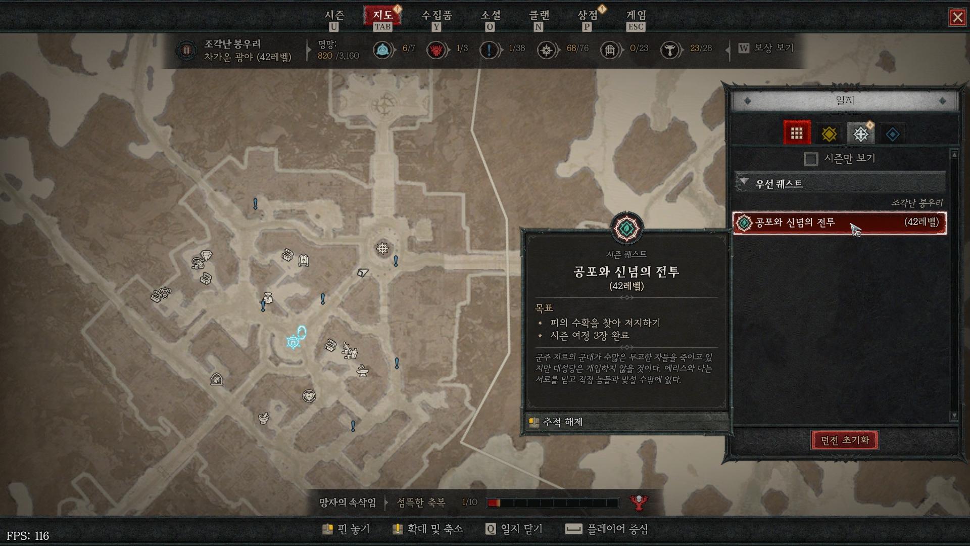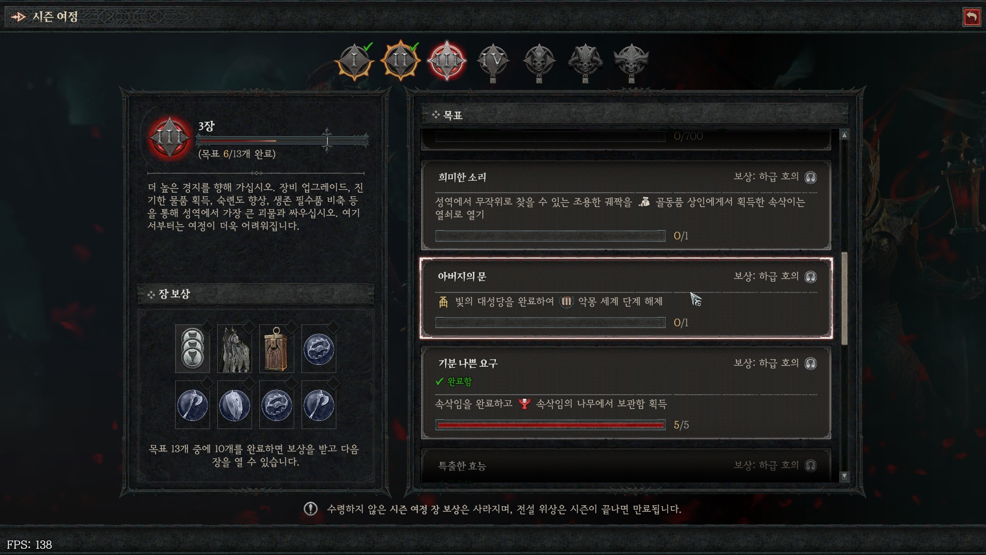 무덤군주를 죽였음에도 던전 완료가 안 되서 개빡쳐갖고 이시점에 디아 접을뻔함이번에 새로 나온 도적전용 꾸미기 룩본능적으로 엉덩이만 보게 된다.40레벨이 넘었는데 빛의 대성당 가라는 퀘스트가 안 뜬다.그런데 시즌 목표에는 빛의 대성당 완료가 있음. 그래서 그냥 깨니까 악몽 난이도에 진입할 수 있었다.구상법사에게 필수 위상인 중력의 위상을 드디어 먹음던전 랜덤보스인 도살자를 처치하고 얻은 식칼룩할로윈기간에 20레벨까지 무료 이벤트를 진행했는데, 그래서 나름 대기열도 생겼다.첫노드 보강박아야되는데 이악물고 안나오는거보소 시발련시즌패스로 얻은 유령군마 룩무한의 의복 왕나이스화염법사 전용 고유템 열받네가스라이팅아니 나 화법안한다고 시발련아악던 39단계 클 기념스샷