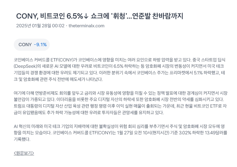 CONY, 비트코인 6.5%↓ 쇼크에 '휘청'...연준발 찬바람까지